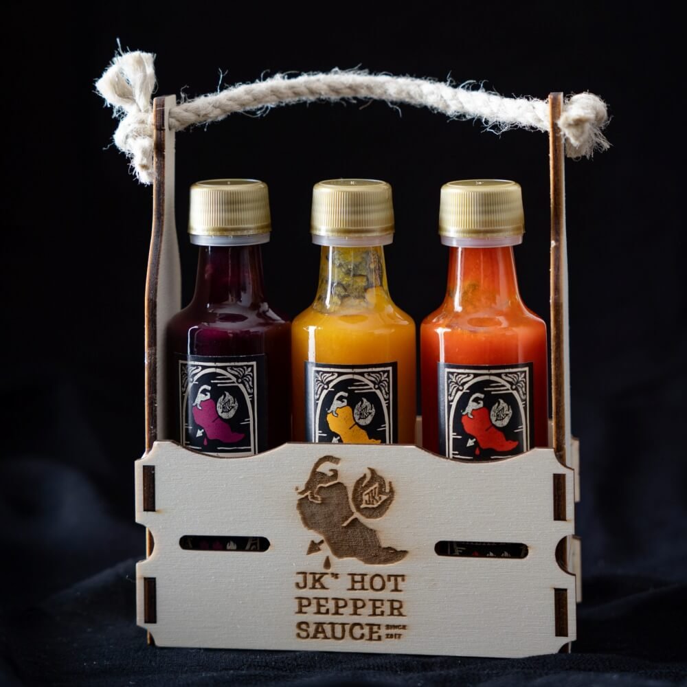 Komplet malo pakovanje. Tri sosa po želji u drvenoj kutiji: 3 x 100ml.